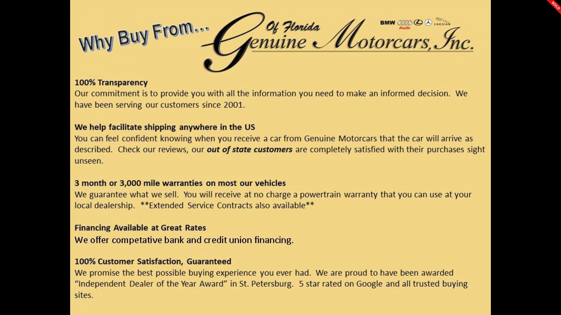 Yes, we are Genuine, our Motto is “We take care of our customers before, during, and after the sale!”  We are conveniently located by 275 off 22nd Avenue North near US 19 and just 30 minutes away from Tampa International Airport.